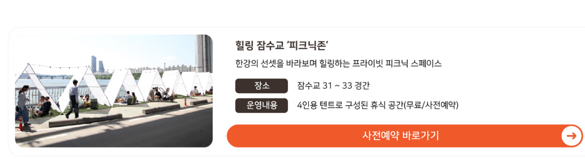 - 피크닉 힐링존은 텐트 및 피크닉 소품이 제공되며, 사전예약을 통해 공간을 확보할 수 있음
