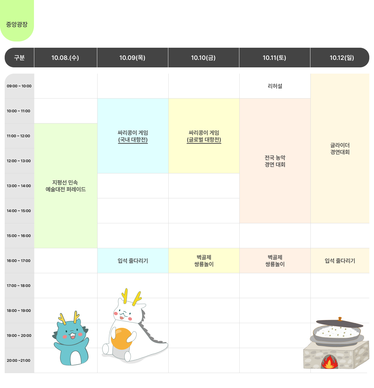 - 17:00 푸드존/굿즈 → 18:00 공개방송/버스킹 → 20:00 이후 쌍룡놀이·멀티미디어 쇼 감상.