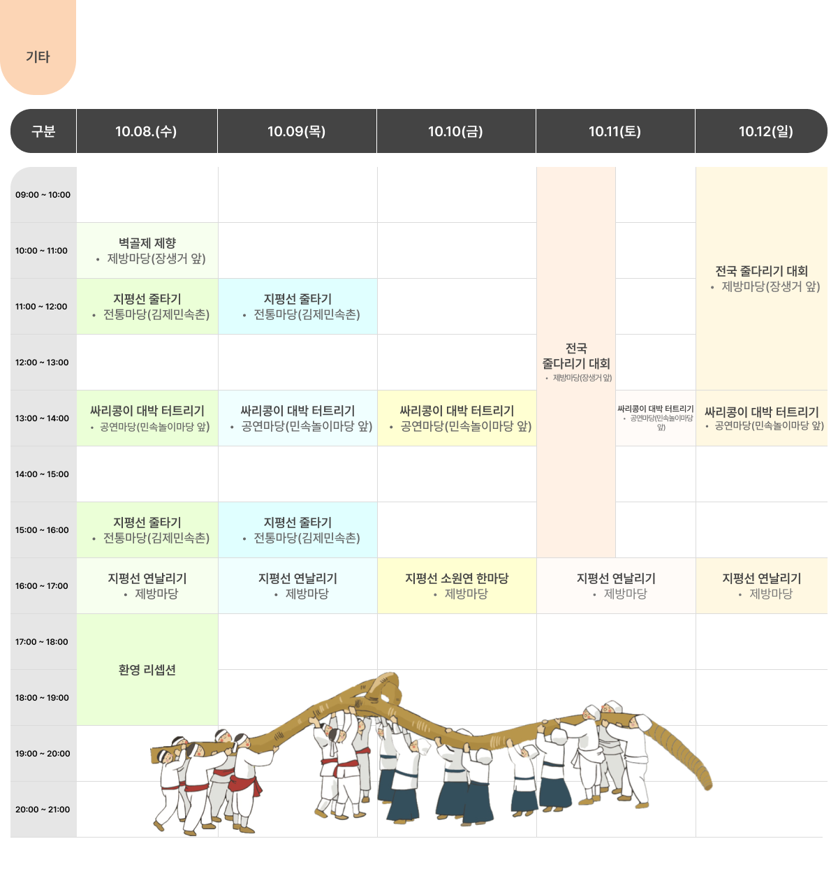 - 12:00 시내권 셔틀 승차 → 13:00 먹거리·전시 → 15:00 전통놀이·퍼레이드 관람 → 18:30 뮤직 페스타 → 20:00 파이널.