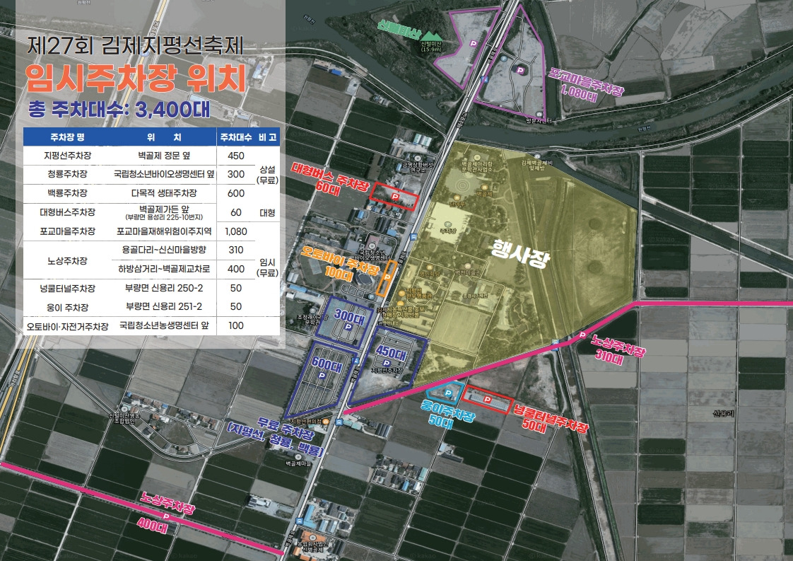 - 주차/셔틀: 시내권 ↔ 벽골제 무료 셔틀 운행, 임시주차장 분산 배치(노선도·시간표는 공식 사이트 이미지 공지).