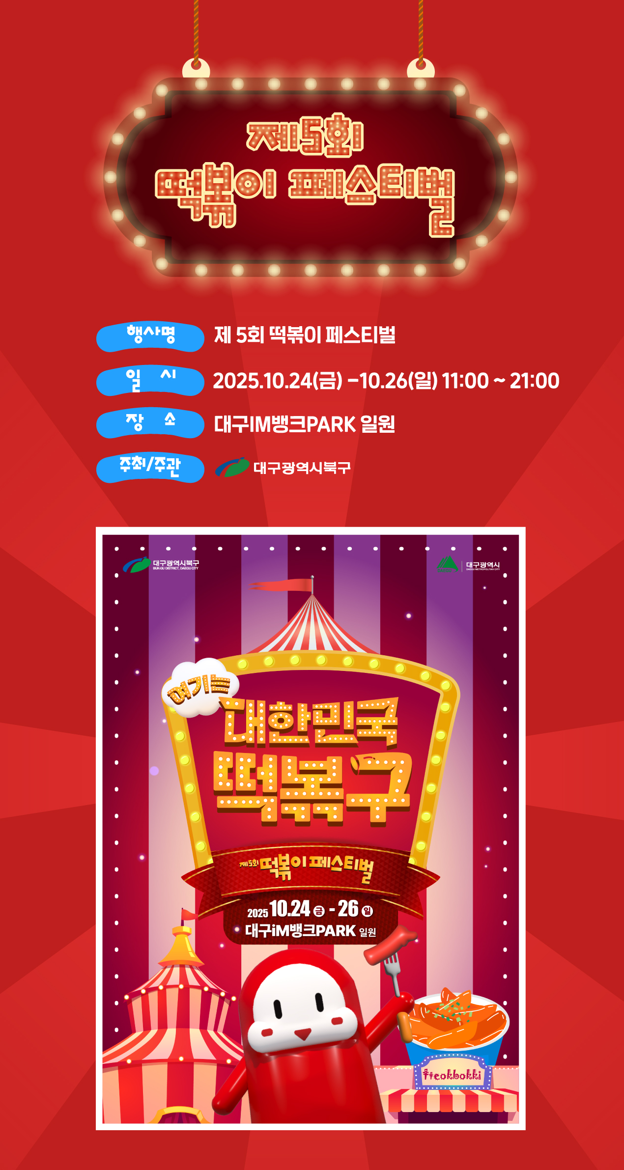 분식의 성지 대구 북구가 올가을, 다시 ‘떡볶구’로 변신합니다. 제5회 대구 떡볶이 페스티벌이 10월 24일(금)~26일(일) 사흘간 대구 iM뱅크파크(구 시민운동장) 일원에서 열려 전국의 떡볶이, 튀김, 순대, 디저트와 레트로 감성 공연·체험을 한자리로 소환합니다. 올해 캐치프레이즈는 “여기는 대한민국 떡볶구”.