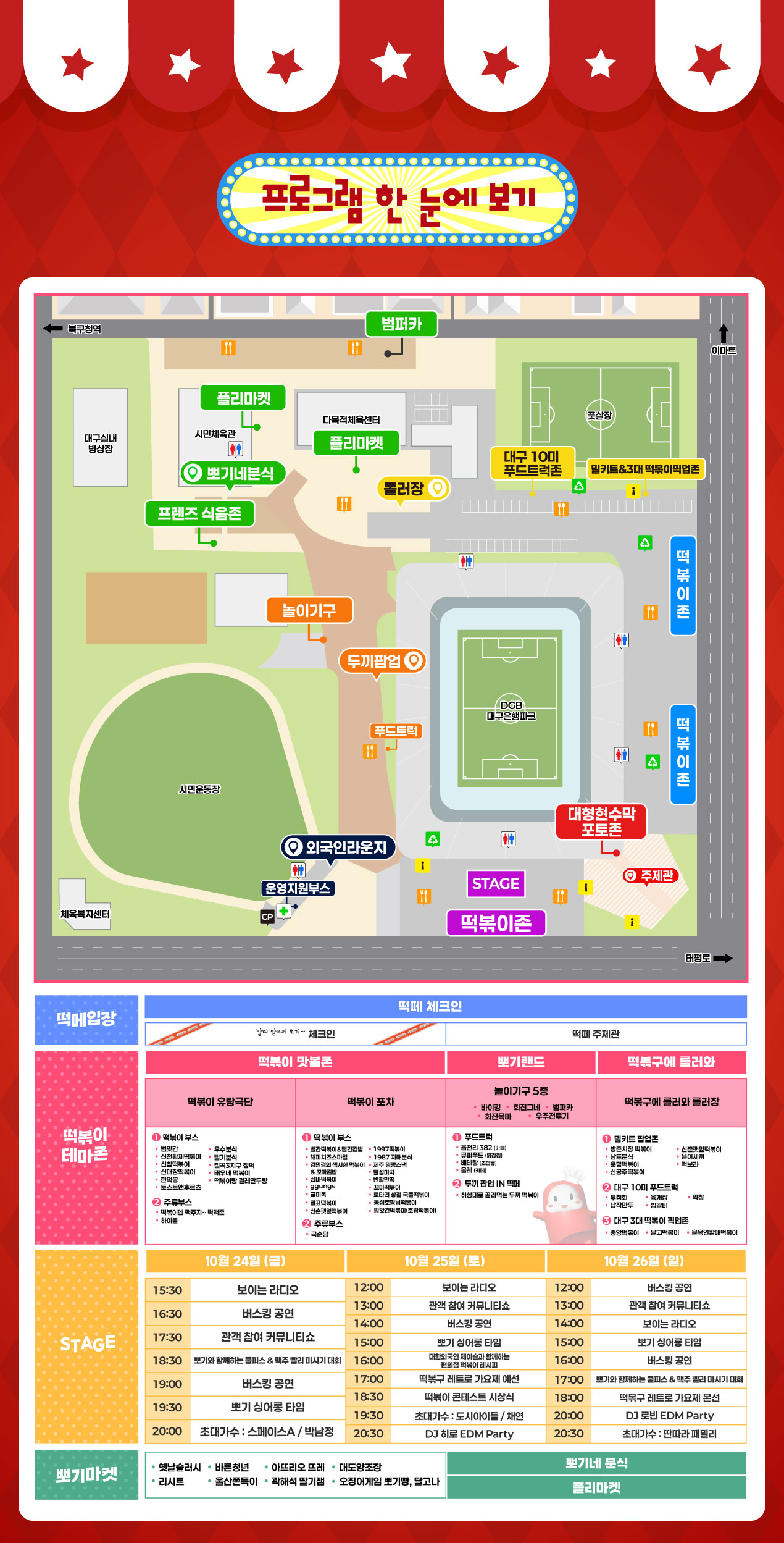 A. 떡볶이 맛볼 존, 유랑마차(보이는 라디오·싱어롱·가요제·외국인 콘테스트), 뽀기랜드(놀이기구), 추억의 롤러장, 떡볶이 콘테스트 본선/시상(26일).