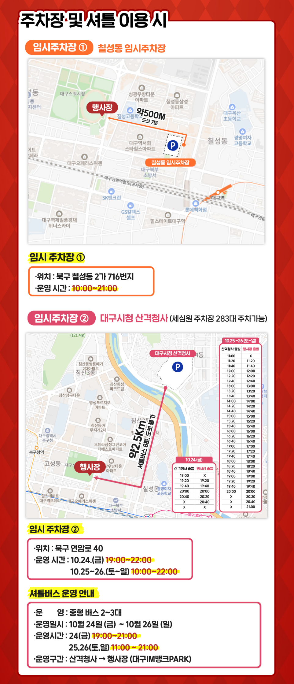 - 셔틀 탑승: 노선·간격은 D-1 공지 확인.