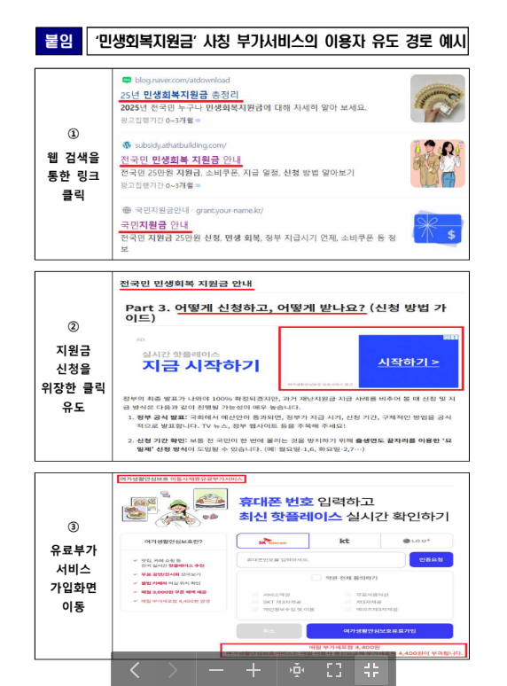 | 주요 수법 | 정부 지원금 명목 문자 → 가짜 웹사이트 → 유료서비스 가입 유도 |