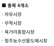 - 자유시장, 무학시장, 육거리종합시장, 청주농수산물도매시장