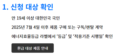 - 모델 확인법: 구매 전 쇼핑몰 상세페이지의 에너지소비효율 등급 라벨과 모델명을 캡처/저장해 두세요. (신청 시 라벨 사진·명판 사진 업로드 필요)