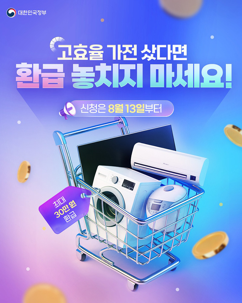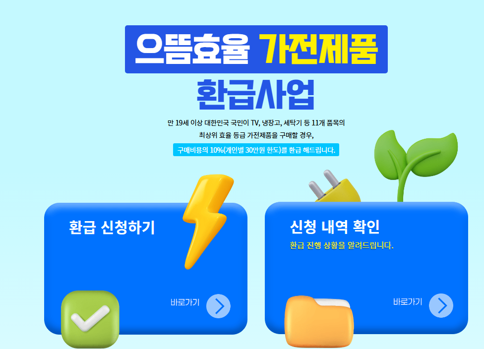 올해 고효율(으뜸효율) 가전 환급사업이 재개됐습니다. 구매가의 10%를 현금으로 환급, 1인 최대 30만 원까지 받을 수 있어요.