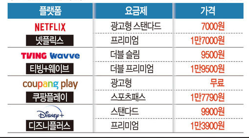 - 넷플릭스 : 광고형 요금제 7,000원, 프리미엄 요금제 17,000원
