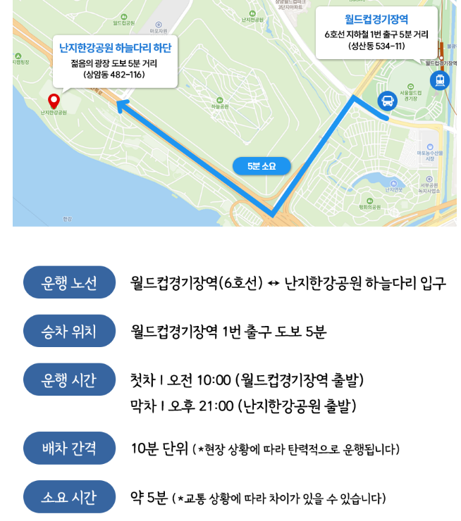 막차 | 오후 21:00 (난지란강공원 출발) - 배차간격: 10분 단위
