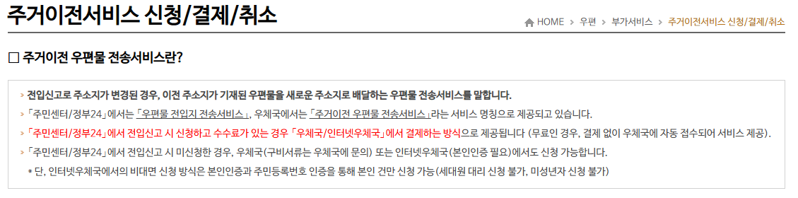 - 우편 → 부가서비스 → 주거이전서비스 신청/결제/취소 클릭