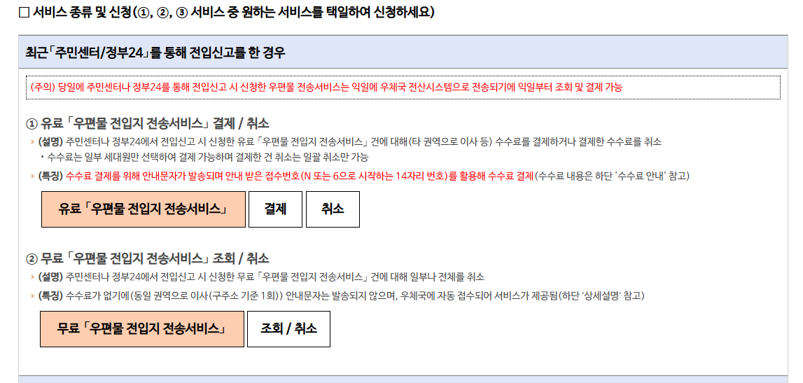 - 인터넷우체국에서 개별 신청/추가 신청 가능. 전입 후 14자리 접수번호 안내를 받은 경우엔 그 번호로 진행. 접수번호가 없어도 본인인증으로 개별 신청 가능.