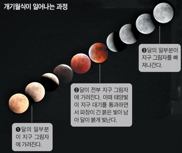 - 개기: 달 전체가 어두워지며 구리빛~암적색으로 변함(대기 상태에 따라 색조가 다름).