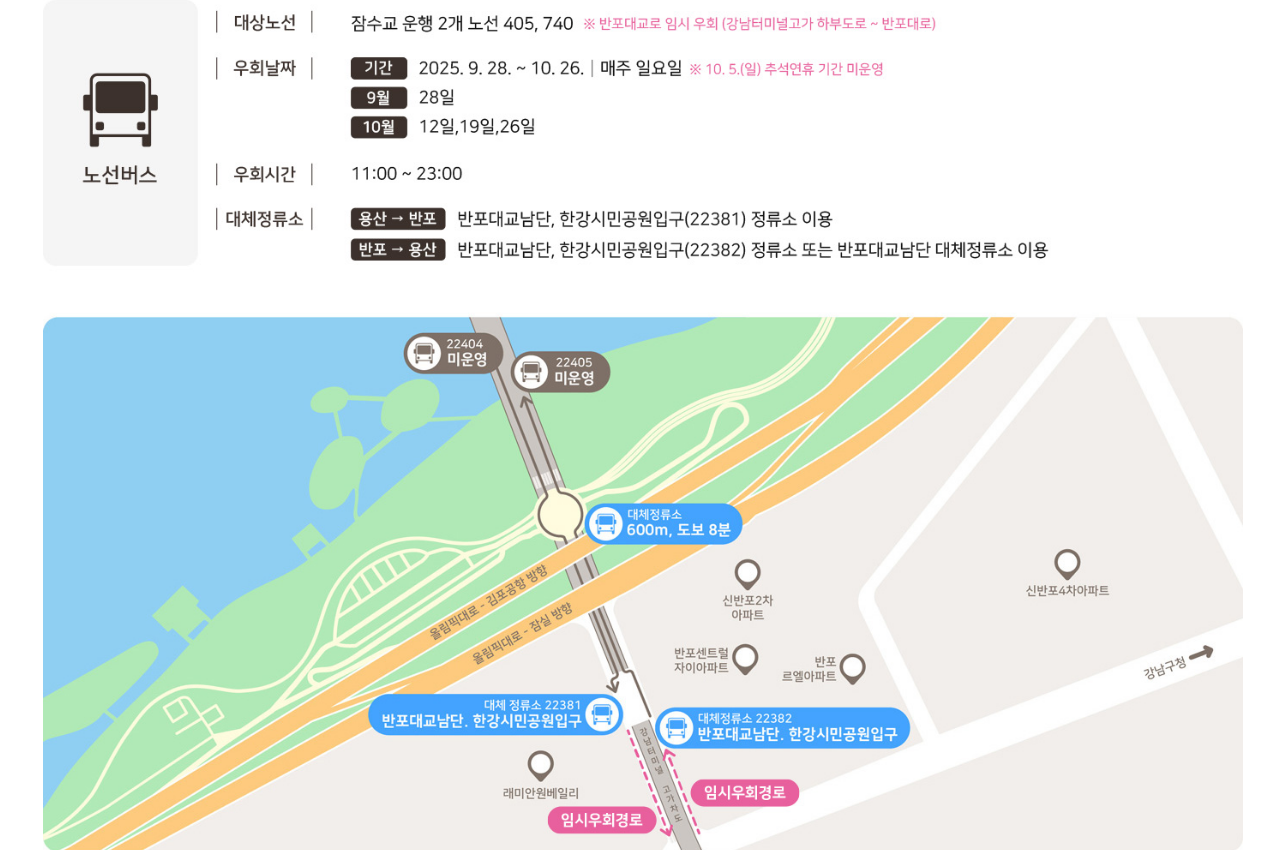- 일반 버스 노선 중 잠수교를 지나는 노선(예: 405, 740번)은 우회 또는 정류소 변경 가능성 있음