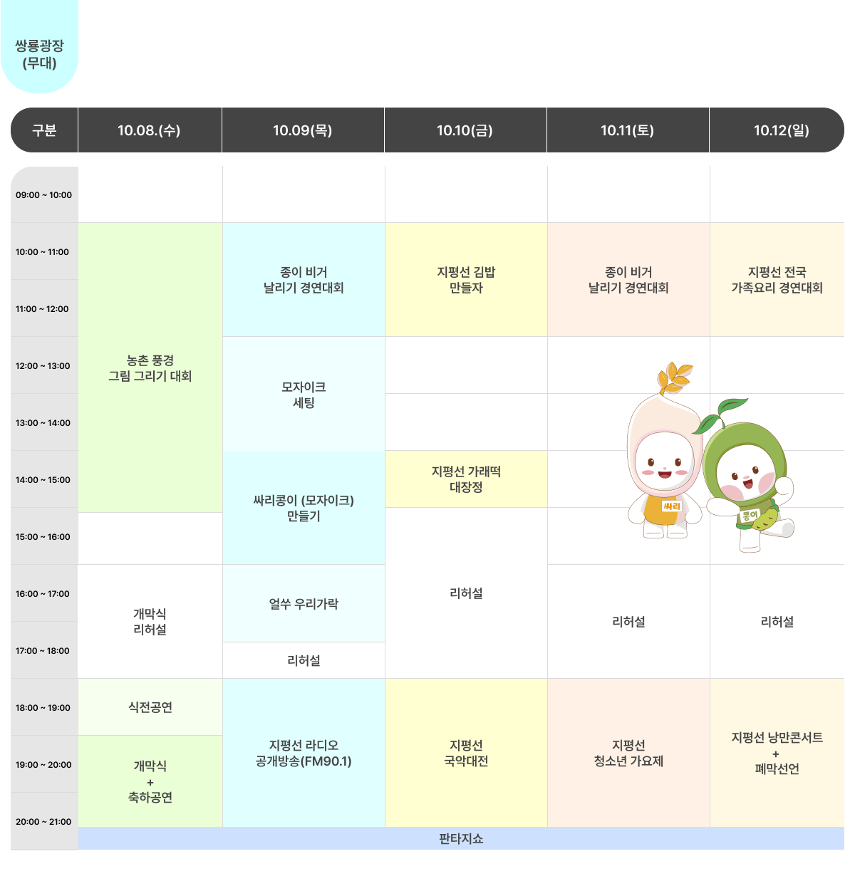 - 굿즈: 캐릭터 싸리콩이 굿즈, 지역 브랜드 콜라보 제품. (신규 프로그램 ‘캐릭터샵’·‘오뚜기샵’ 안내)