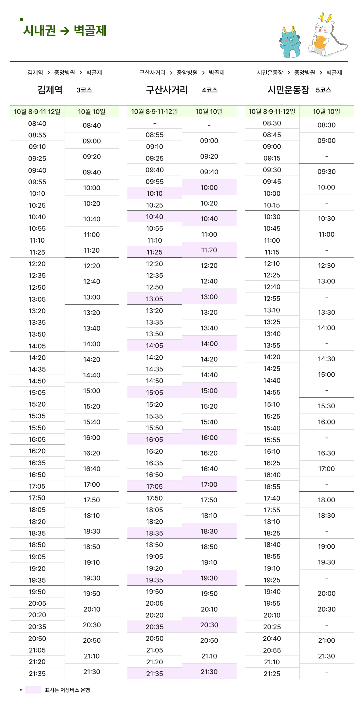 - 시내권 ↔ 벽골제 순환 셔틀이 노선도·시간표와 함께 공지되어 있어요(상·하행표 별도). 주중·주말 배차가 다를 수 있으니 당일자 시간표 이미지를 꼭 확인하세요.