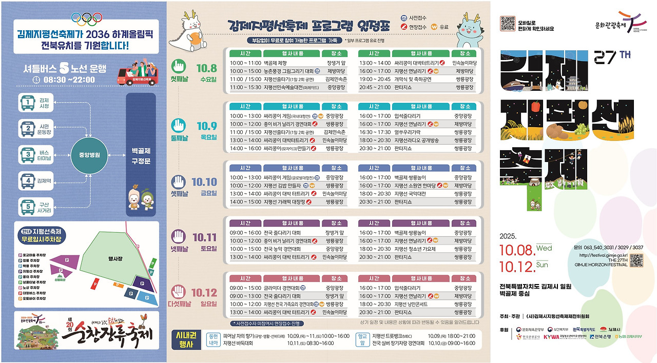 - 일정·장소: 10/8~10/12, 벽골제 중심(+김제 시내).
