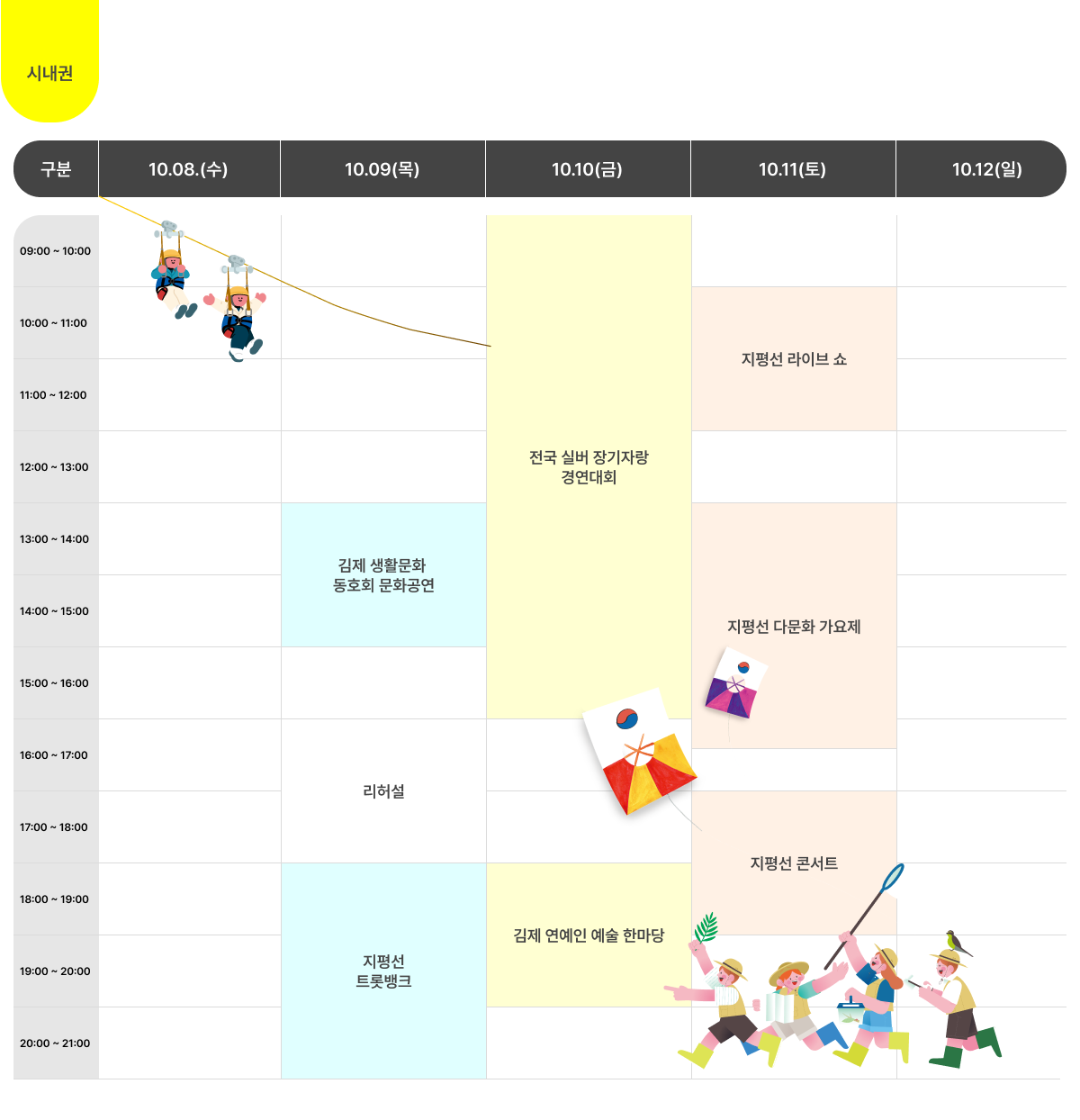 - 12:00 시내권 셔틀 승차 → 13:00 먹거리·전시 → 15:00 전통놀이·퍼레이드 관람 → 18:30 뮤직 페스타 → 20:00 파이널.