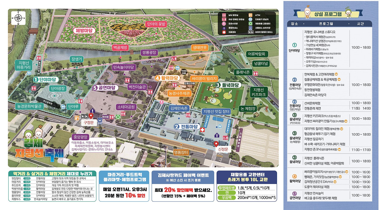 - 먹거리: 김제쌀 떡볶이, 지역 농특산물 시식·직화 굽기 체험, 로컬 디저트. (체험·부대 프로그램 섹션)