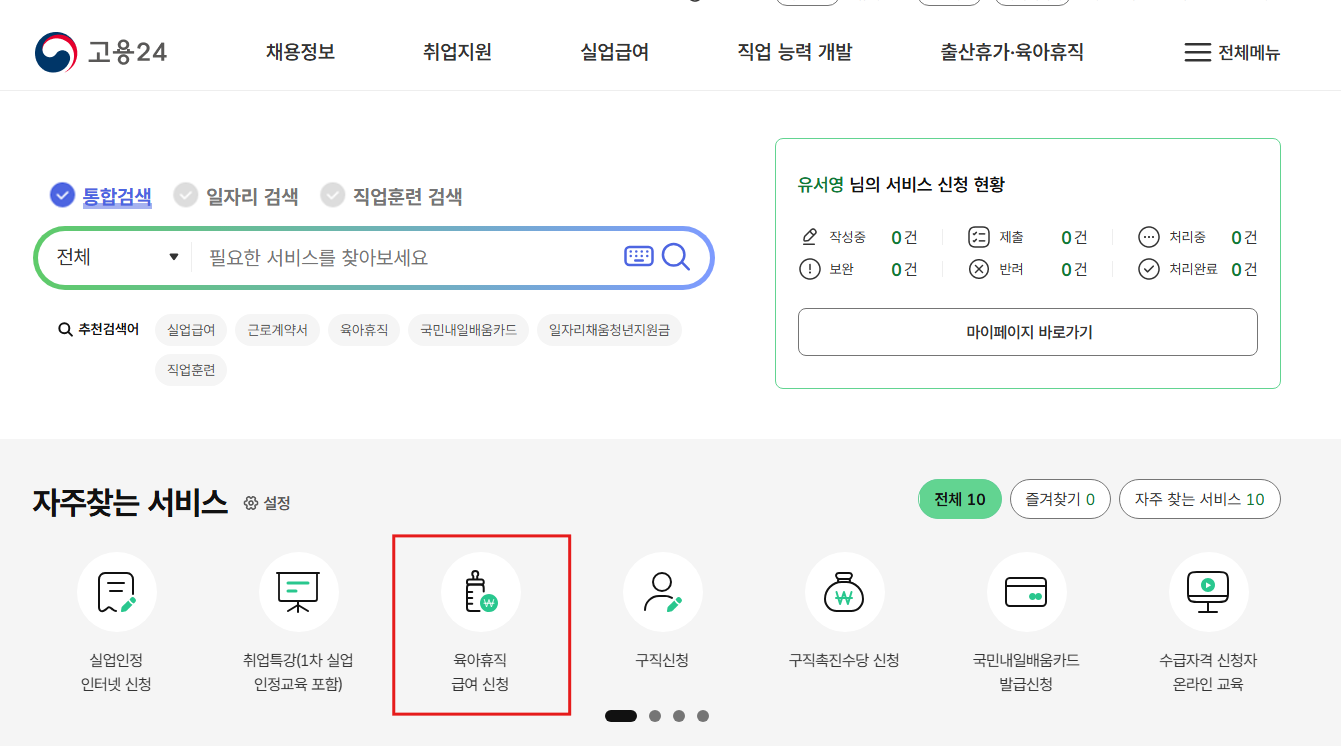 - [개인서비스] > [육아휴직 급여 신청] 메뉴 클릭