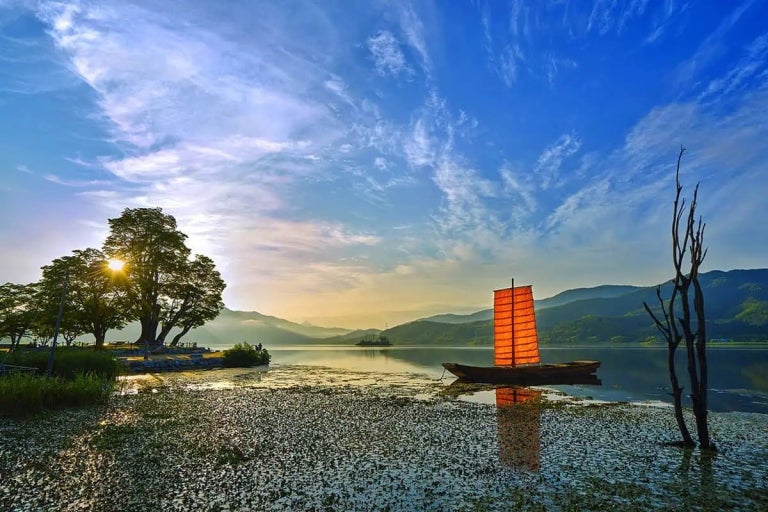 - 느티나무, 나룻배, 안개 낀 물안개길