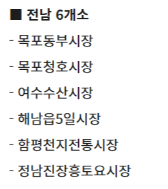 - 목포동부시장, 목포청호시장, 여수수산시장, 해남읍5일시장, 함평천지시장, 정남진장흥토요시장