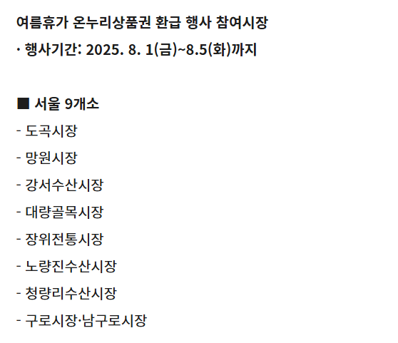 - 서울은 수산물 중심 시장 위주로 9개 시장 환급 행사 포함