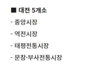 - 중앙시장, 역전시장, 태평전통시장, 문창전통시장, 부사전통시장