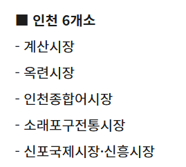 - 계산시장, 옥련시장, 인천종합어시장, 소래포구전통시장, 신포국제시장, 신흥시장