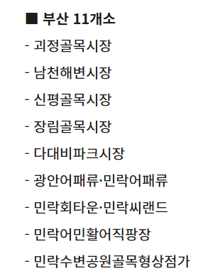- 괴정골목시장, 남천해변시장, 신평골목시장, 장림골목시장, 다대비파크시장, 광안어패류·민락어패류, 민락회타운·씨랜드, 민락수변공원골목형상점가 등
