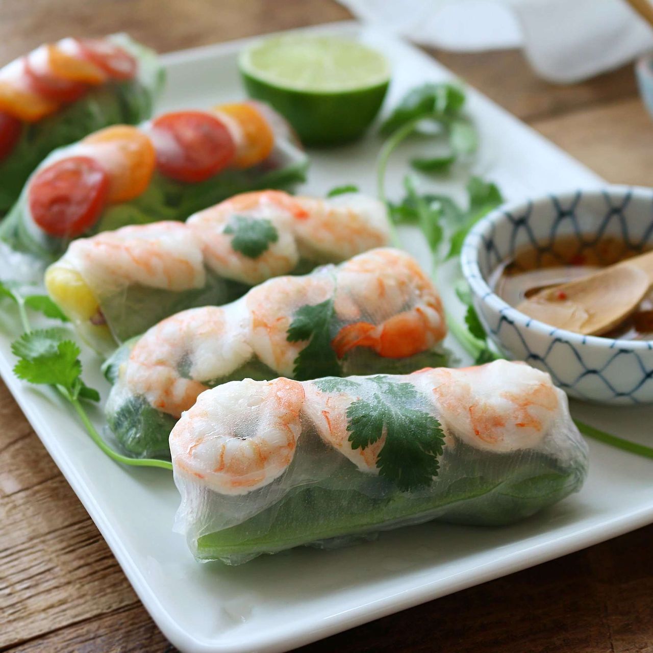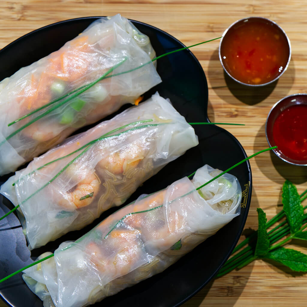 재료(2개): 라이스 페이퍼 2장, 삶은 새우 4마리, 닭가슴살 60g, 채소 믹스(당근·오이·양상추), 라이스 누들 약간(선택)