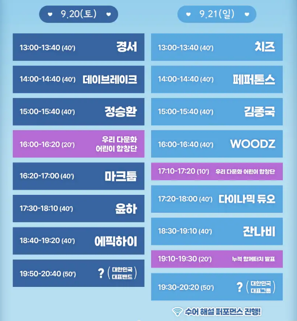 A. 공식 프로그램 페이지에 9/20·9/21 라인업이 정리돼 있습니다.