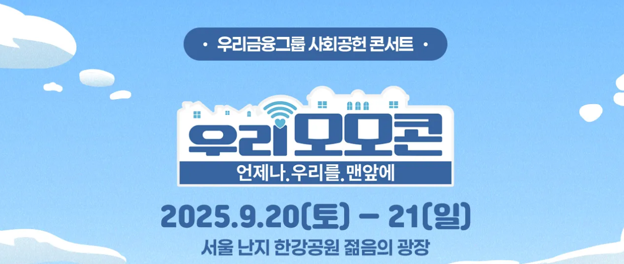 한강 난지에서 매년 가을 열리는 우리금융그룹 사회공헌 콘서트 ‘우리 모모콘’이 2025년에도 돌아옵니다. 올해는 9월 20일(토)~21일(일), 장소는 서울 난지 한강공원 ‘젊음의 광장’ 일대, 행사 시간은 정오 12:00 ~ 21:00로 공지됐고, 무료 콘서트이지만 사전 응모 추첨을 통해 모바일 티켓(QR)으로 입장하는 방식이에요.