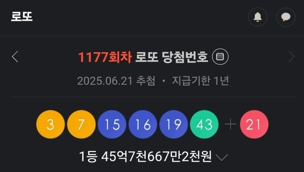 - '잭팟 터졌네'…로또 1177회 당첨번호 1등 45억, 1·2등 같이