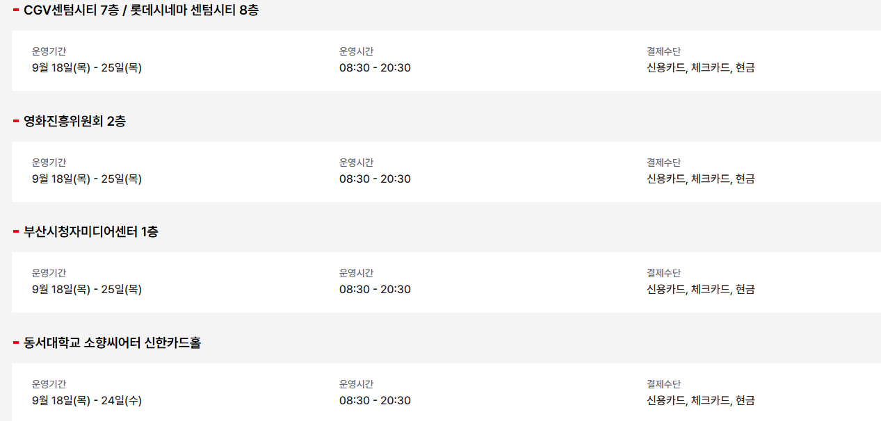 - 기간/장소: 9/17(수)~9/26(금) 영화의전당 야외 사거리 BIFF 매표소.