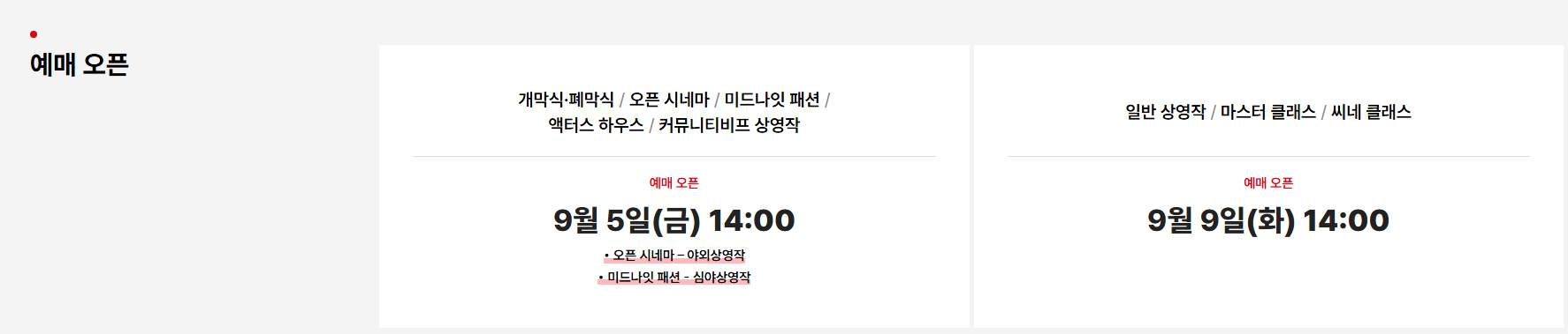 - 유의: 좌석 수 한정, 9/17(수) 개막일에는 다음 날 1·2회차만 판매.