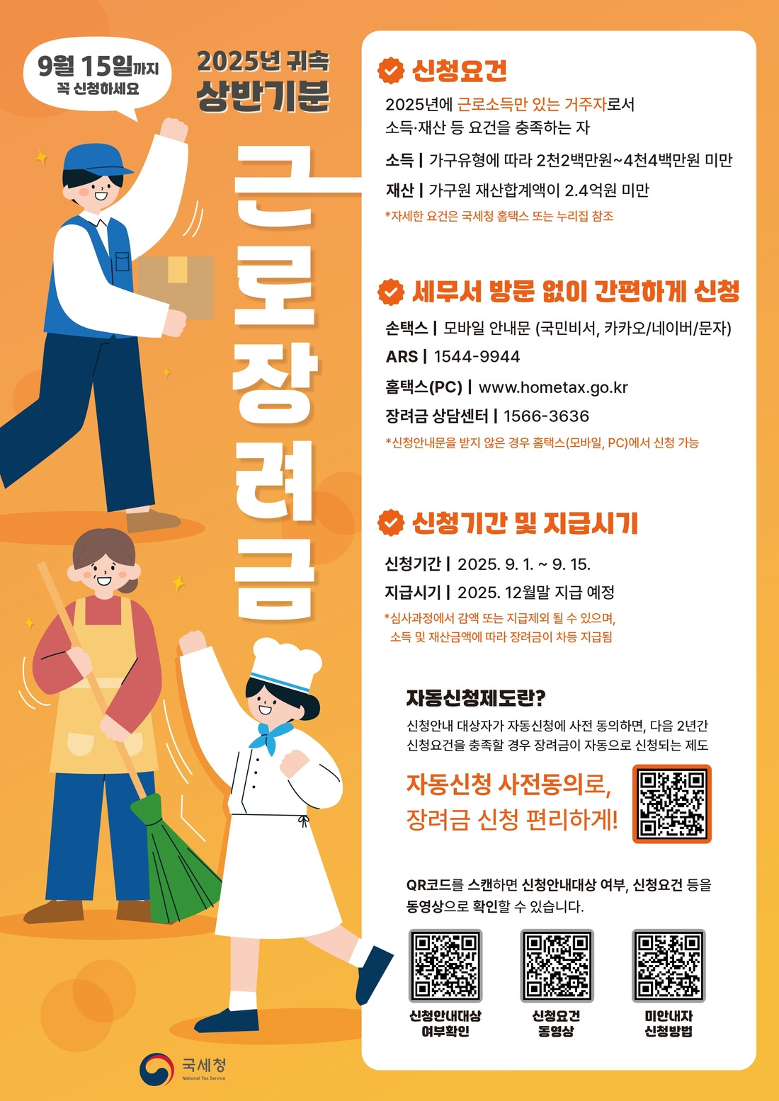 올해 상반기분 근로장려금은 9/15 마감입니다. 모바일 안내문-신청하기 혹은 ARS 1544-9944, 홈택스/손택스 중 편한 방법으로 10분이면 접수 완료예요. 12월 말에 최대 115만 원(가구·소득에 따라 다름)을 선지급(35%)으로 받아 연말 현금흐름을 다듬고, 내년 6월 정산에서 최종 확정받으세요. 제도는 여러분의 근로를 지지하기 위해 존재합니다. 놓치지 마세요.