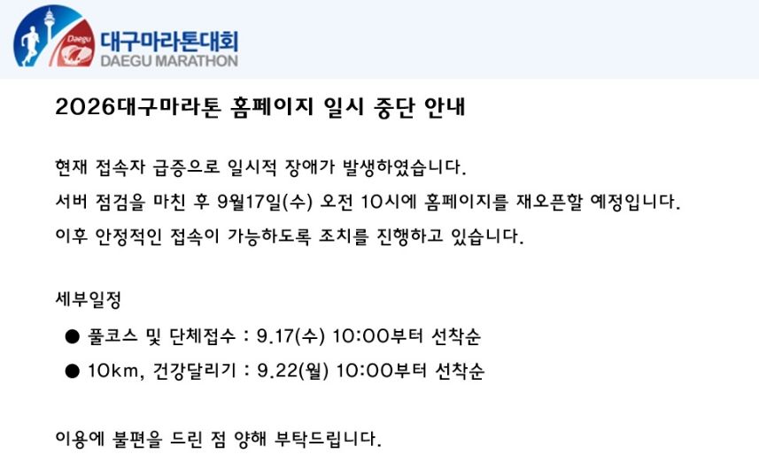 “오전 10시 오픈과 동시에 멈췄다.” 9월 15일(월) 오전 10시, ‘2026 대구마라톤’ 사전접수가 시작되자마자 신청 홈페이지가 먹통이 됐습니다.