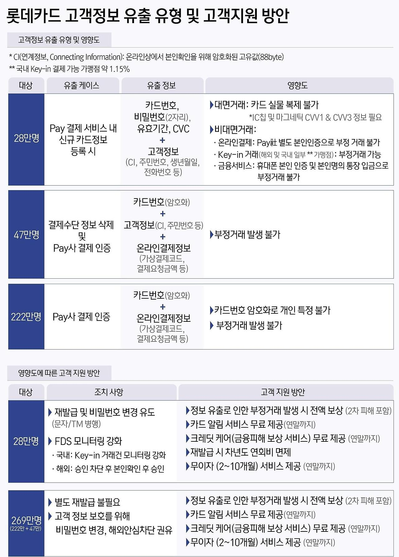 - 회사 조치: 피해자 전원 안내, 28만명 카드 재발급 권고, 부정사용 전액 보상 방침, 보안 투자 확대 발표